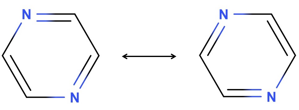 Figura 1. Formule di risonanza della pirazina. La freccia a doppia punta non indica un equilibrio chimico, ma rappresenta il fatto che la struttura reale non coincide con nessuna delle due formule, bensì con un unico ibrido di risonanza. Con il termine “pirazine” si indica invece l’intera famiglia dei derivati della pirazina, ottenuti introducendo sostituenti sugli atomi di carbonio dell’anello.